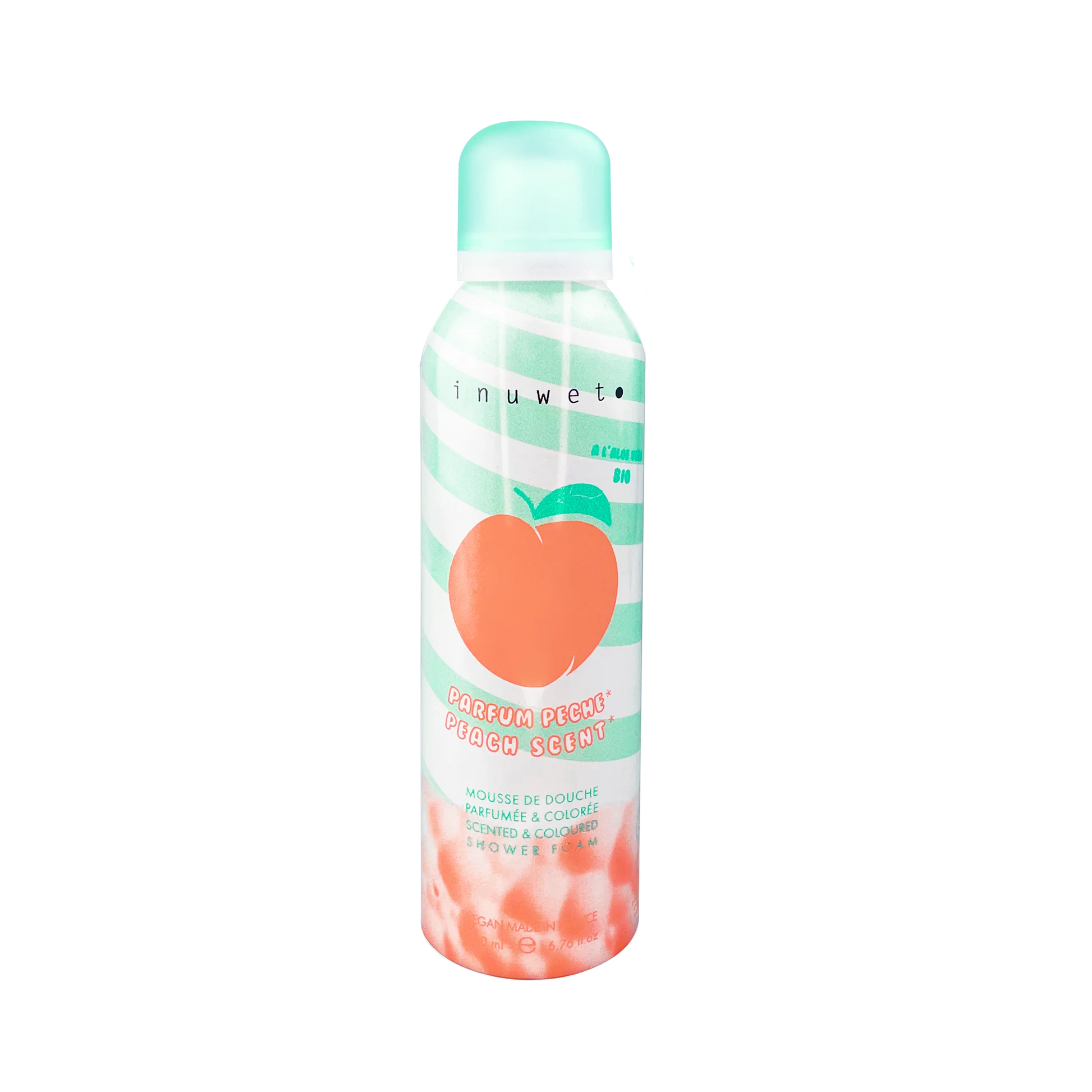 Une mousse de douche colorée orange au délicieux parfum de pêche et 2 accessoires: une éponge fruit accompagné d'un chouchou en velours corail.