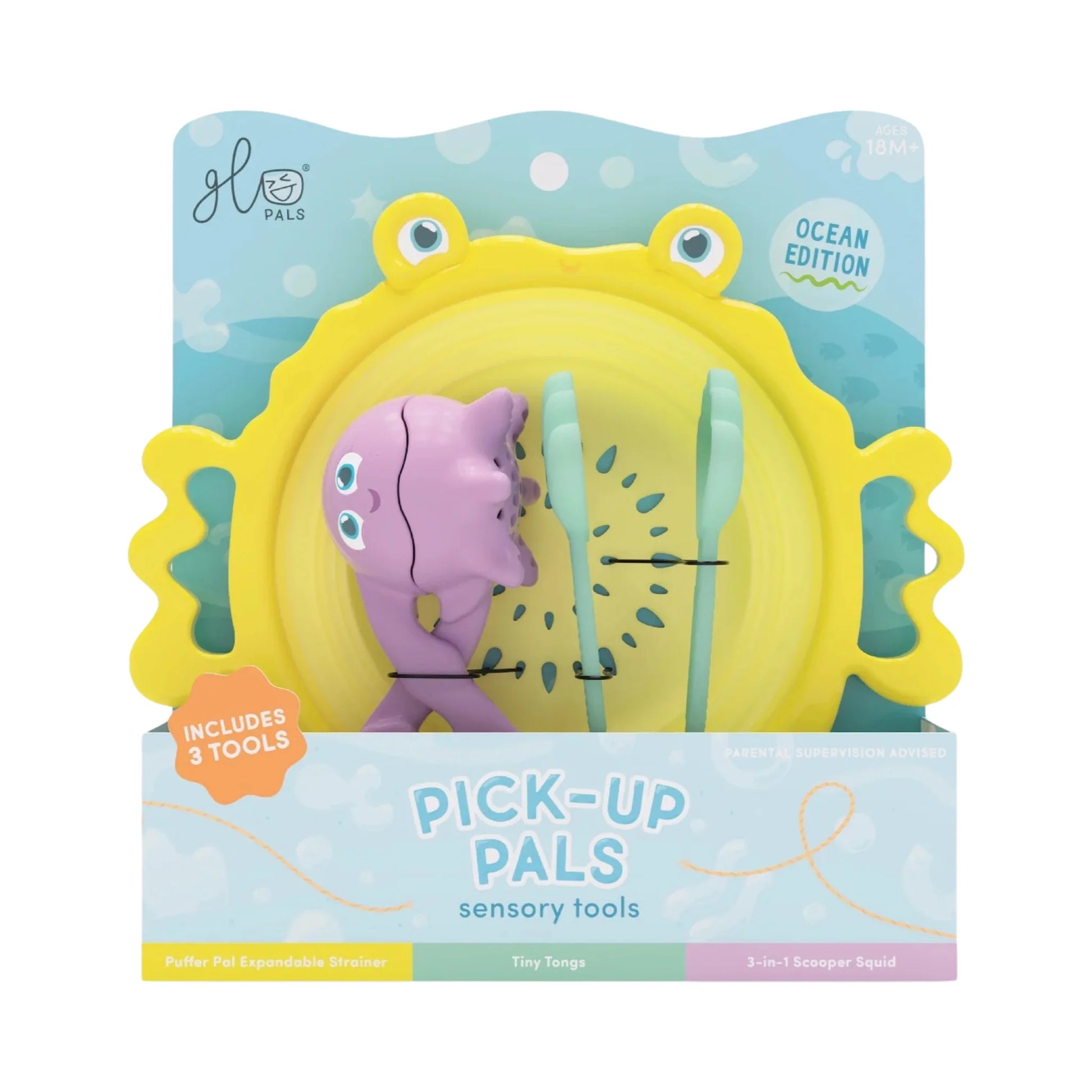 3 outils sensoriels sont inclus : Puffer Pal Expandable Strainer, "Clamp" Shell Tiny Tongs et un Scooper Squid 3-en-1 !